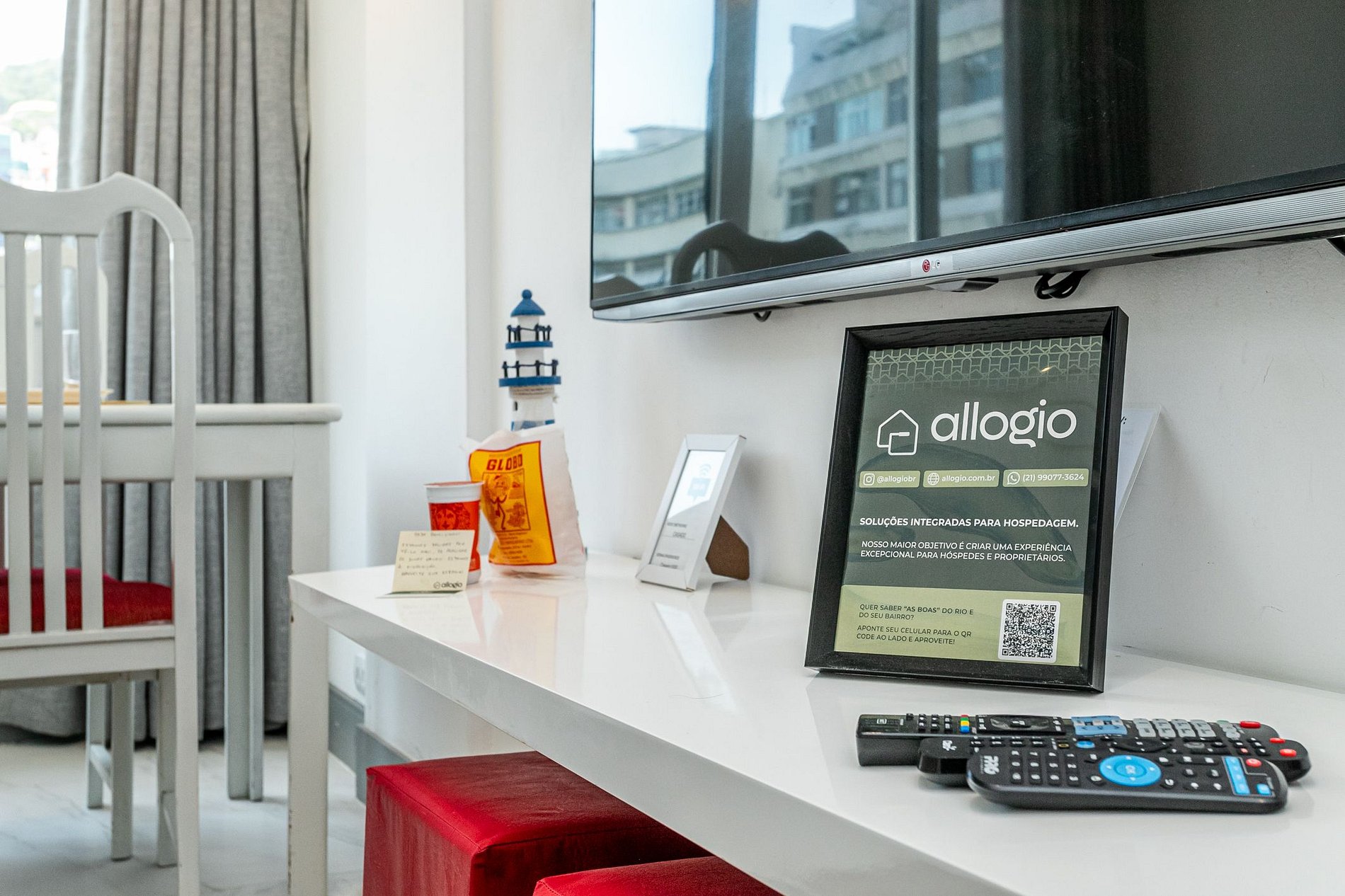 Na televisão da sala você poderá dispor de canais de TV à cabo e nos quartos poderá dispor de uma Smart TV para que você acesse aos seus streamings preferidos.