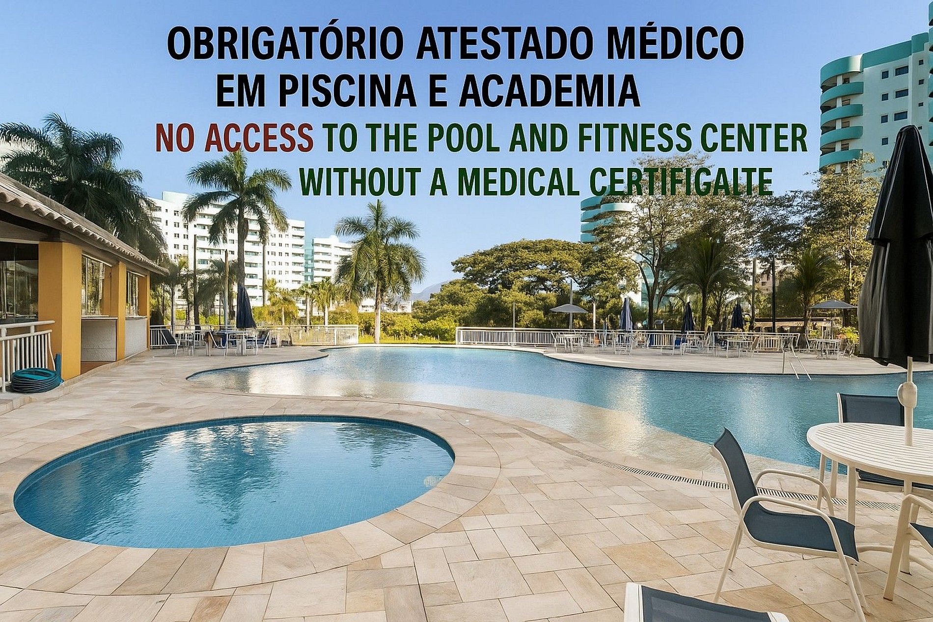 TO USE THE SWIMMING POOL, A MEDICAL CERTIFICATE IS REQUIRED, as mandated by the condominium to ensure the safety and well-being of all users.