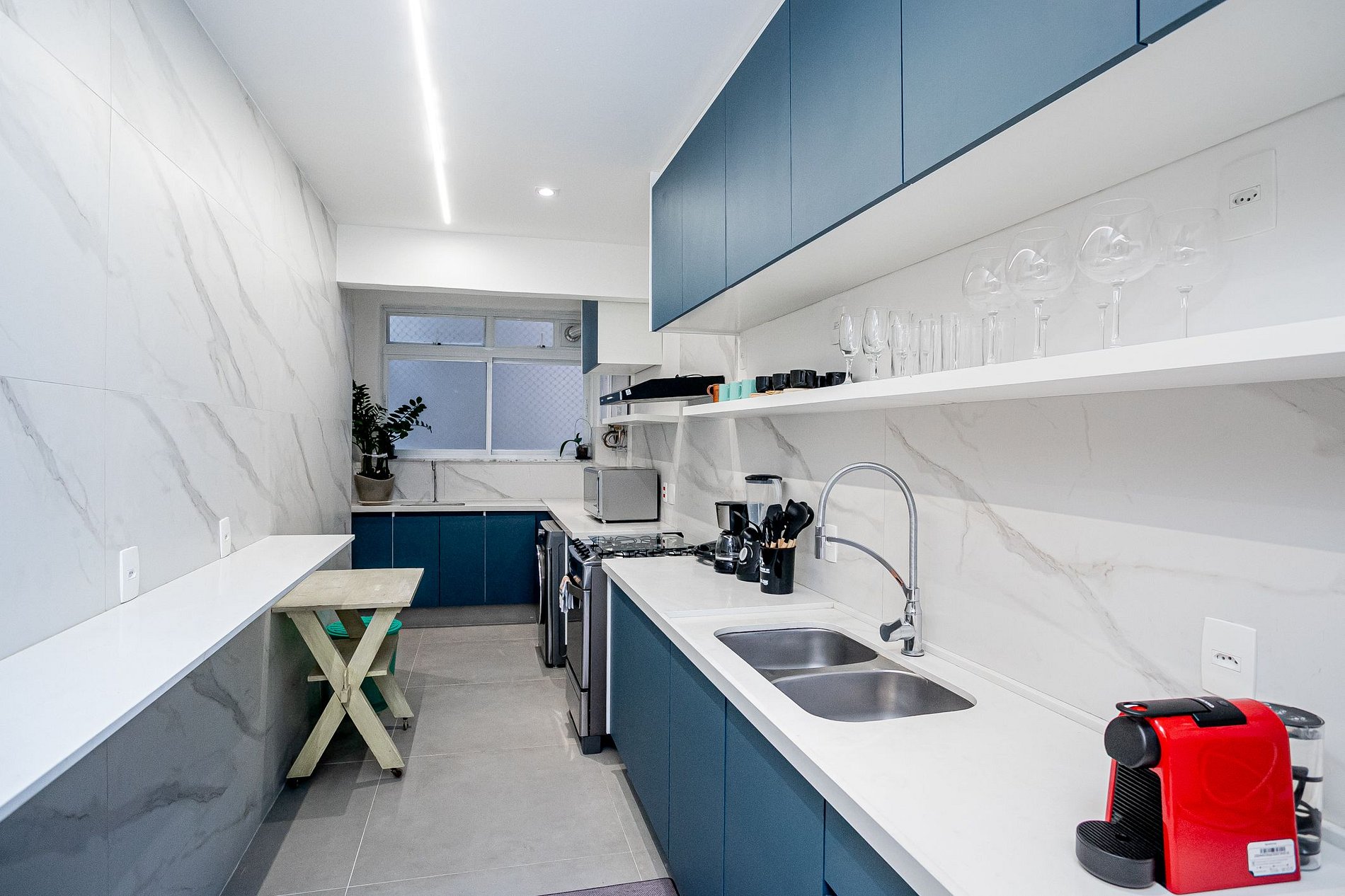 A cozinha é totalmente equipada com geladeira, fogão, forno, micro-ondas, cafeteira, liquidificador e sanduicheira — ideal para preparar refeições com facilidade. Você estará a apenas 50 metros de um supermercado, além de estar cercado por farmácias, cafés, padarias, lojas e todo o comércio local.