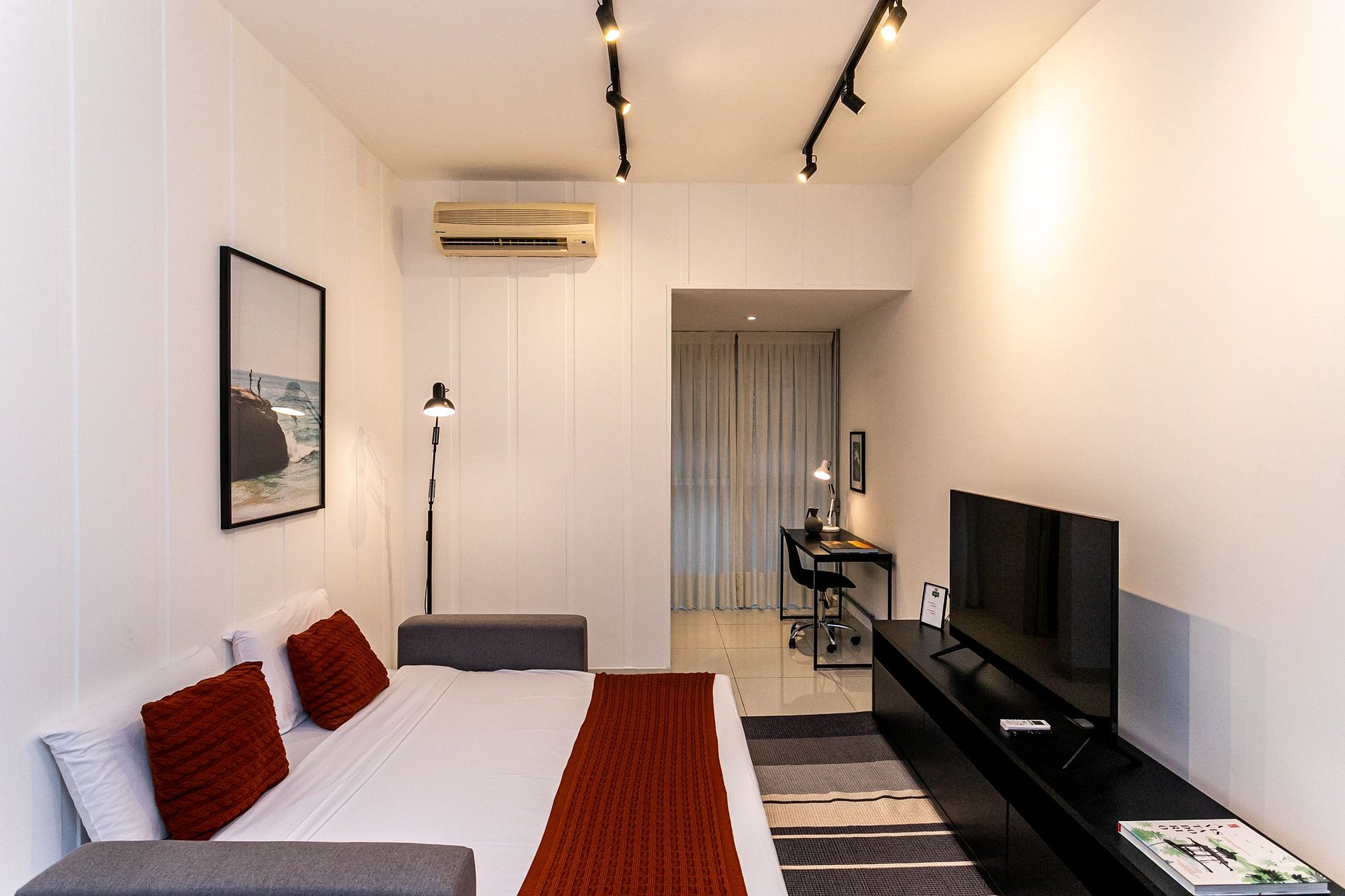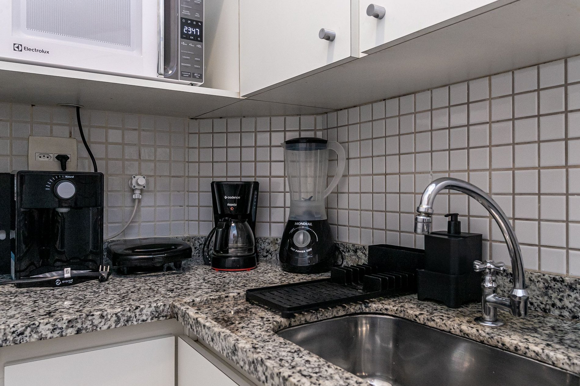 O apartamento conta com 1 suíte, sala de estar com Smart TV para conectar o seu próprio streaming (Não tem TV à cabo), 1 sofá cama de casal, mesa de trabalho, além de sala de jantar, cozinha equipada com fogão, forno, micro-ondas, geladeira e eletrodomésticos (cafeteira, liquidificador e sanduicheira) e uma lavanderia com tanque e máquina de lavar e secar.