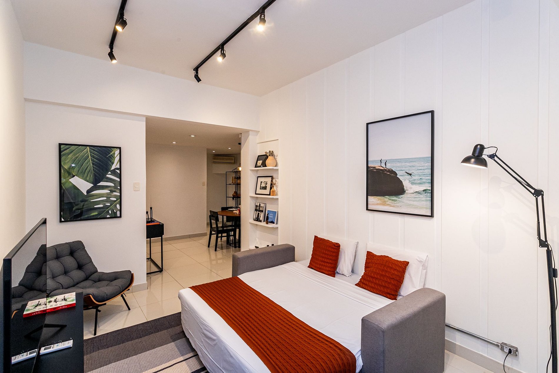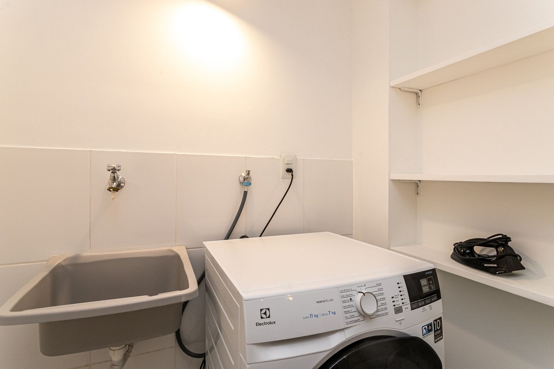 O apartamento conta com 1 suíte, sala de estar com Smart TV para conectar o seu próprio streaming (Não tem TV à cabo), 1 sofá cama de casal, mesa de trabalho, além de sala de jantar, cozinha equipada com fogão, forno, micro-ondas, geladeira e eletrodomésticos (cafeteira, liquidificador e sanduicheira) e uma lavanderia com tanque e máquina de lavar e secar.