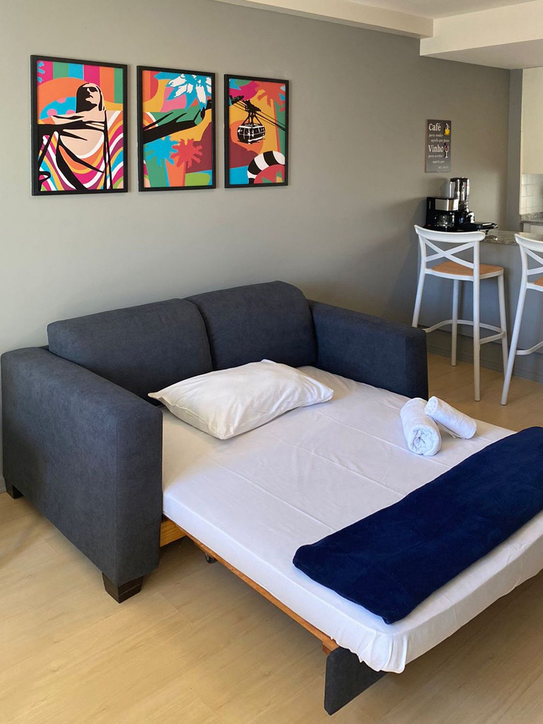 Apt com quarto com cama Queen, Tv Smart com canais abertos, armário e cofre. Sala com sofá cama de casal, mesa de jantar para 2 pessoas, Tv Smart e cozinha americana