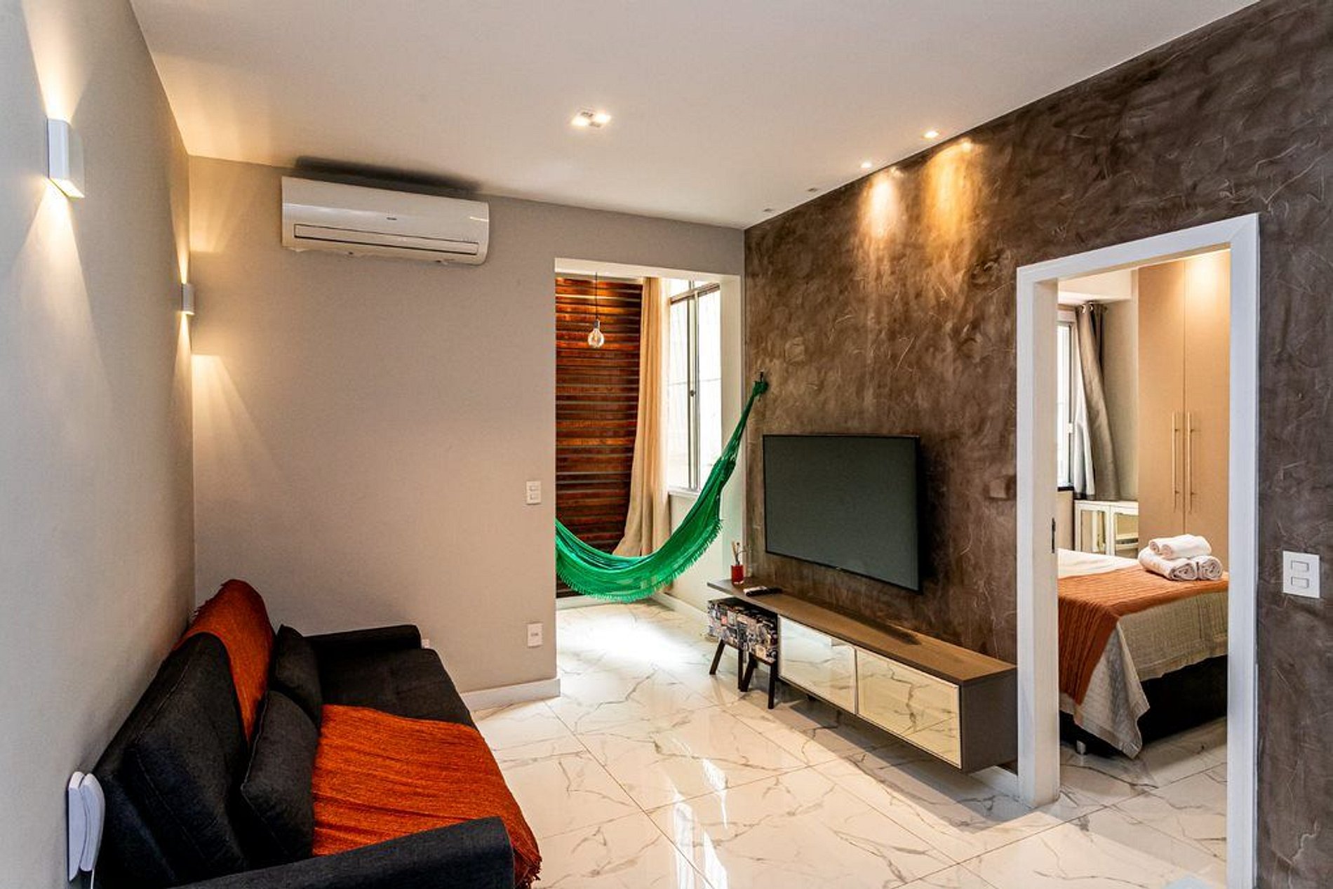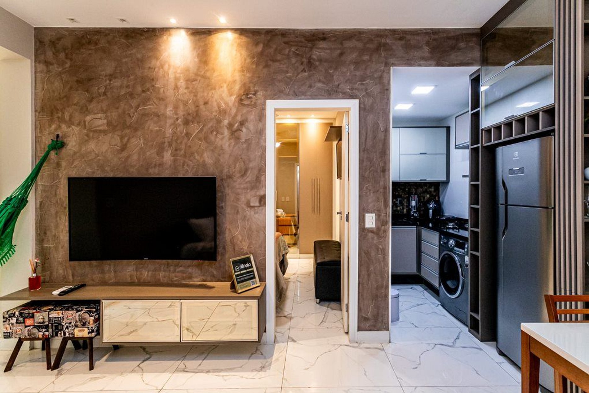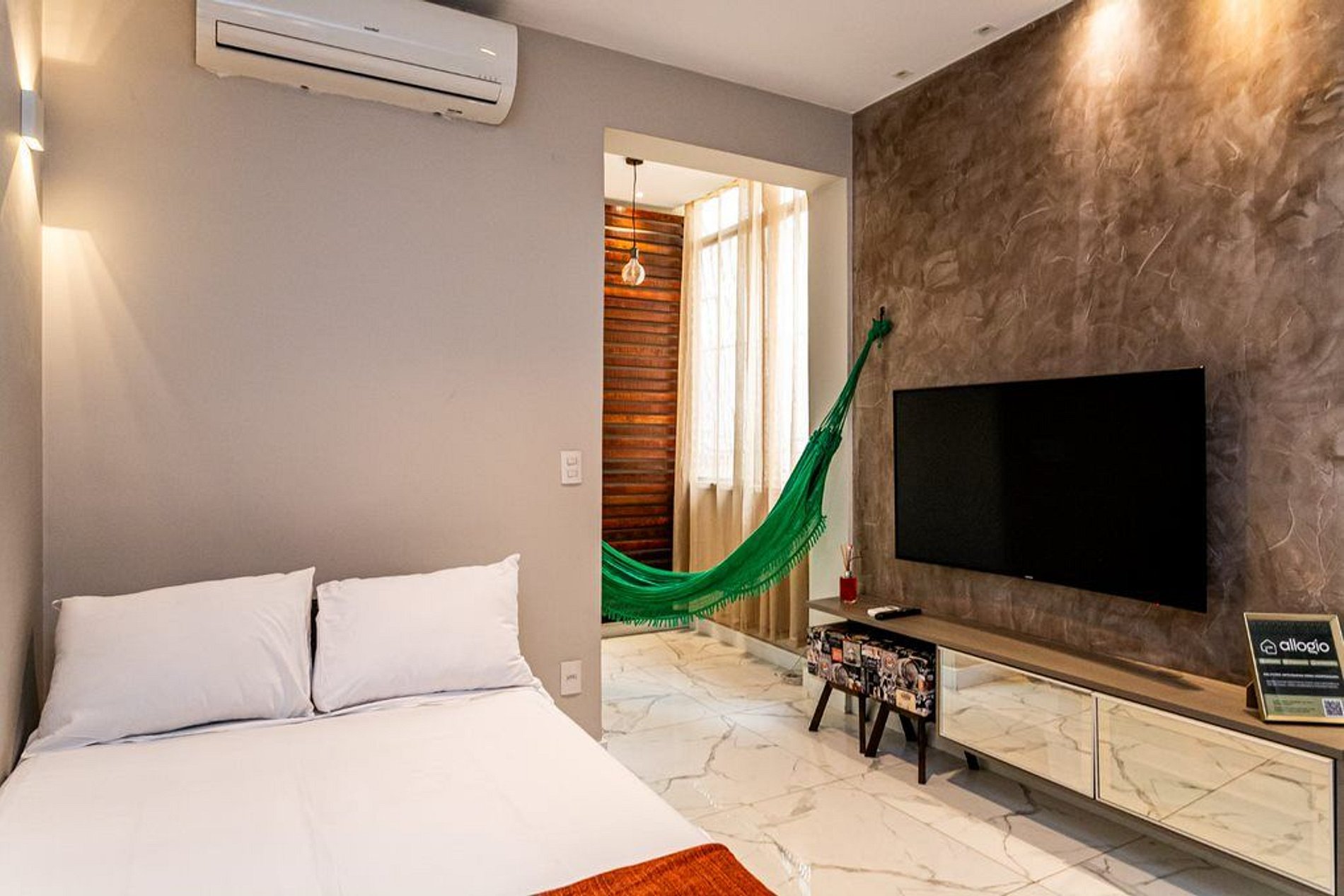 Hospede-se no conforto de um apartamento com cozinha completa, armários de roupas, TVs, máquina de lavar roupas, ar condicionado na sala e no quarto e uma típica rede para relaxar. Sinta-se em casa!