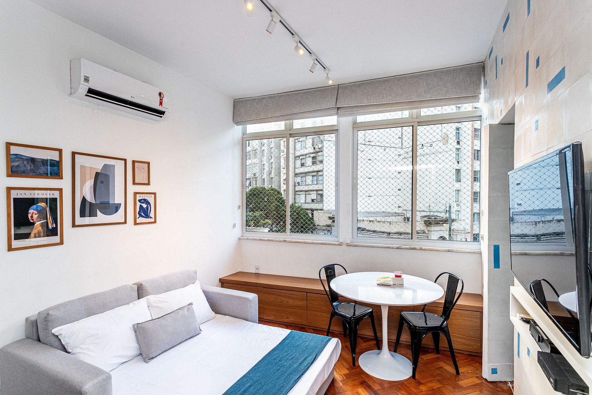 Apartamento moderno, decorado por arquiteto, a apenas 2 quarteirões da Praia de Copacabana. O apartamento é muito confortável, com muito estilo e a comodidade de um quarto com cama de casal e Smart TV, sala com TV à cabo, sofá cama e cozinha americana com geladeira grande, fogão de 4 bocas, micro-ondas e eletrodomésticos. Além disso ainda tem uma máquina de lavar roupas e um espaçoso banheiro. Muito conforto, próximo à restaurantes, comércio local e um Shopping Center a 800 m.