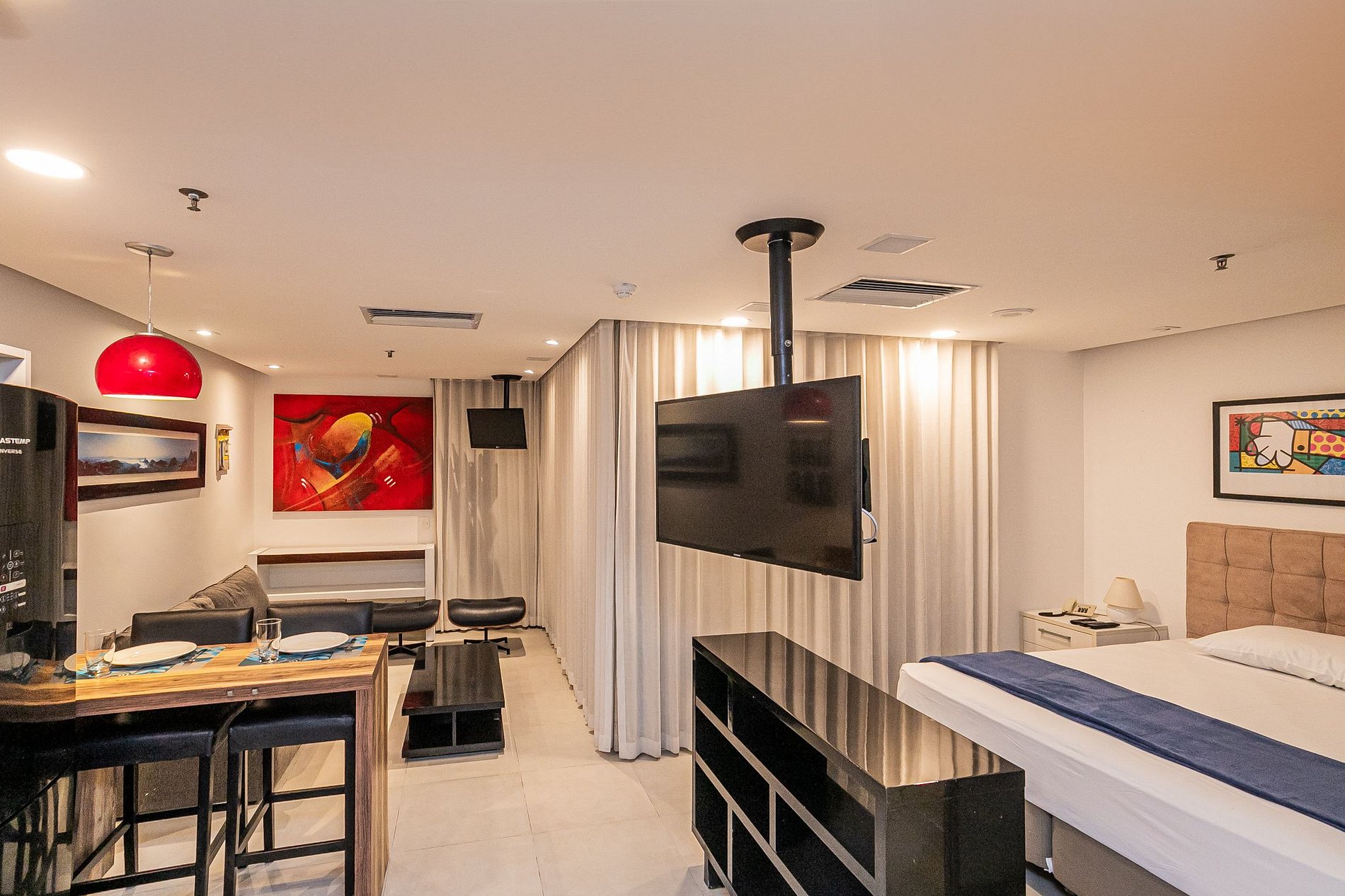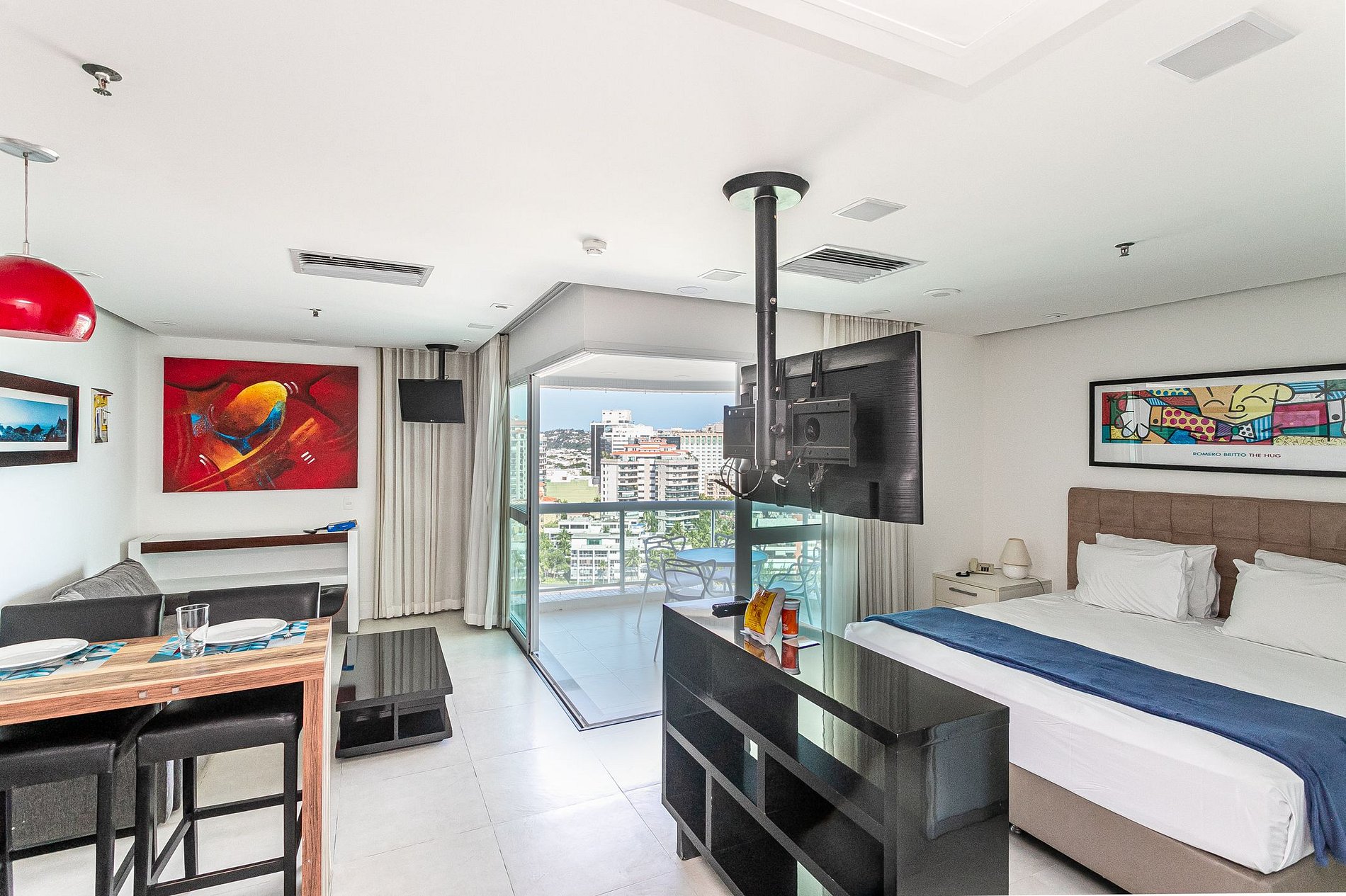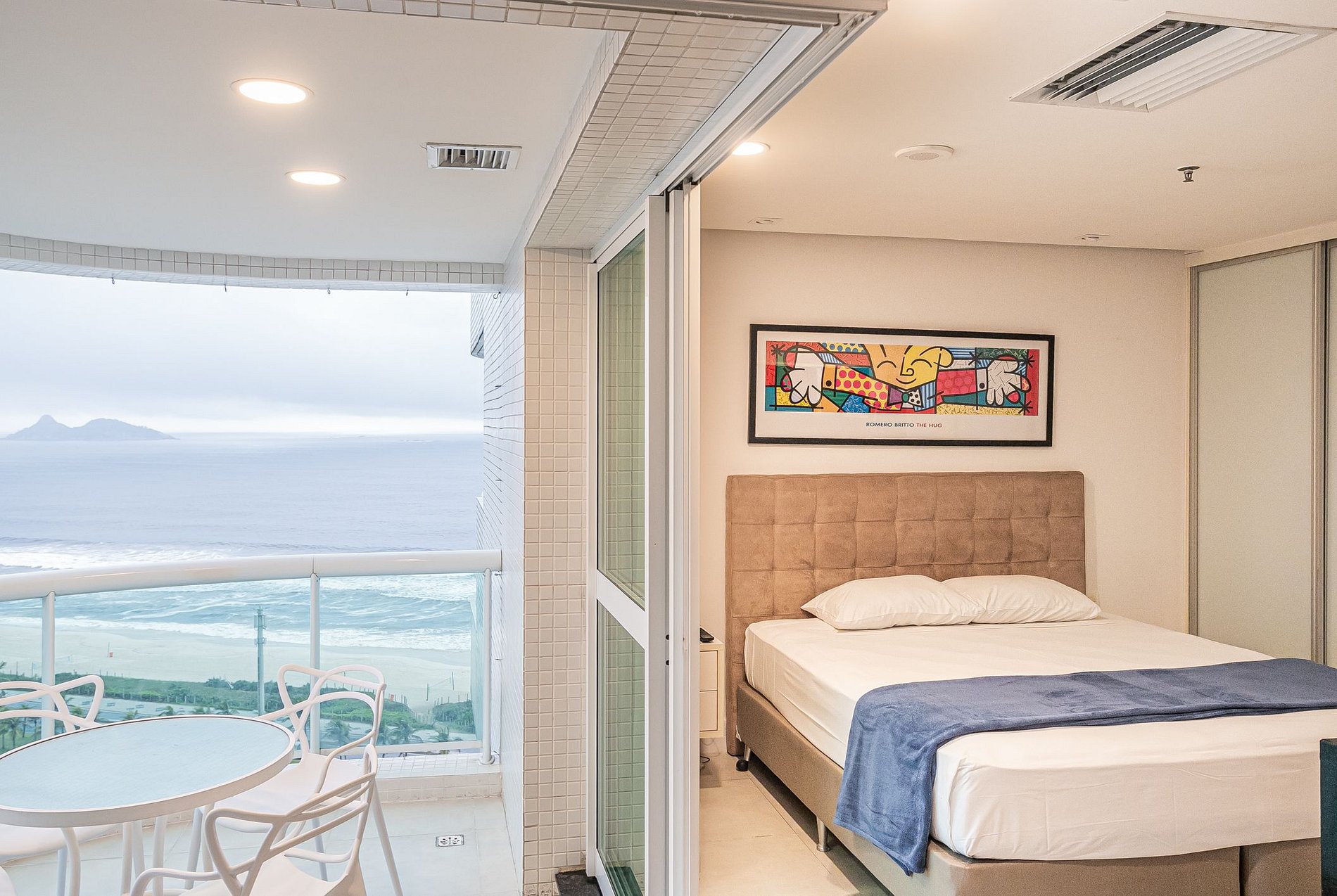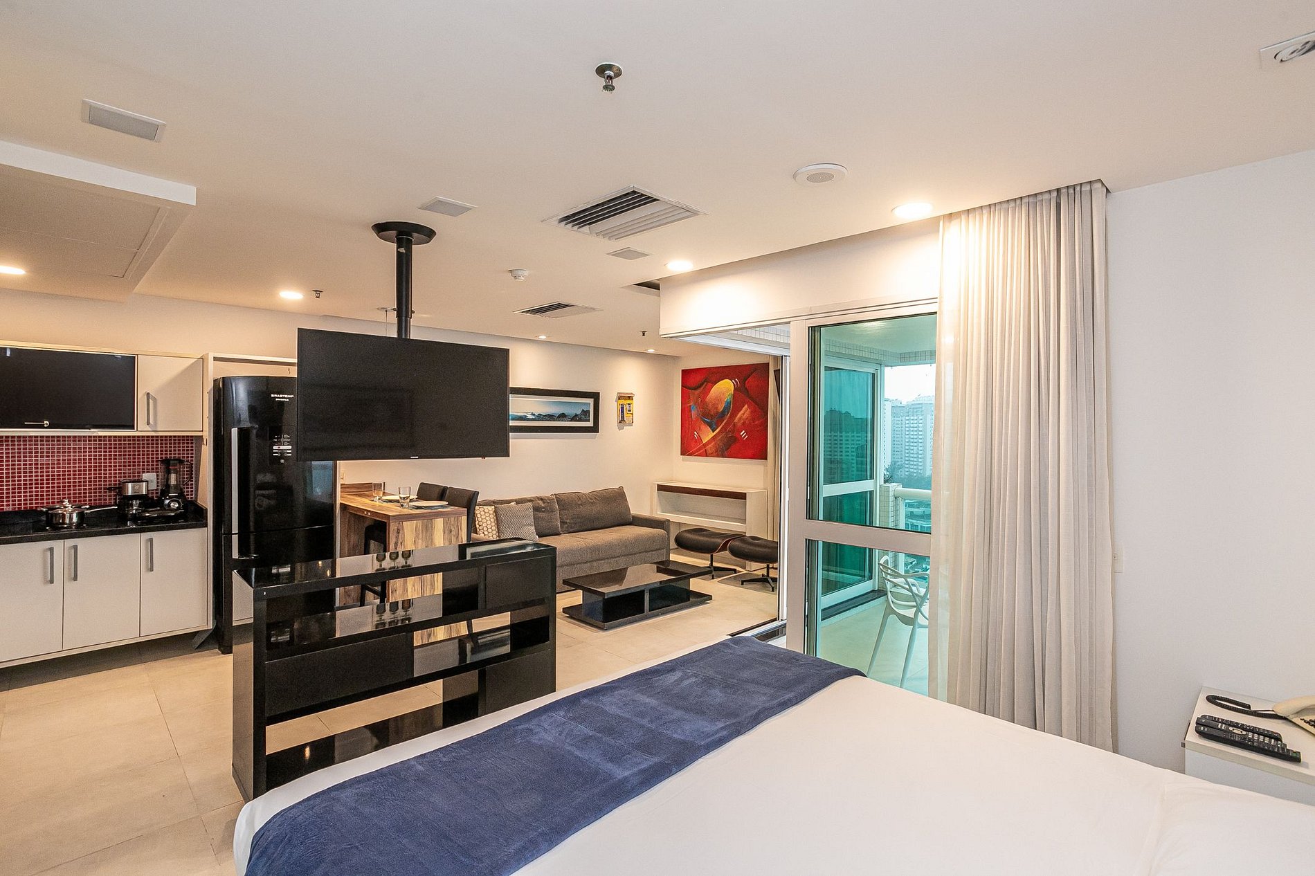 Estudio com cama Queen, cozinha integrada, sala de estar e varanda com vista total para a praia da Barra da Tijuca. O condominio oferece toda a estrutura de lazer (piscina, sauna, academia), Spa (serviço oferecido diretamente no hotel e não incluso na hospedagem) e serviço de limpeza. O prédio também conta com lavanderia pay per use. Tem a comodidade de um restaurante no lobby, salão de beleza e serviço de câmbio.