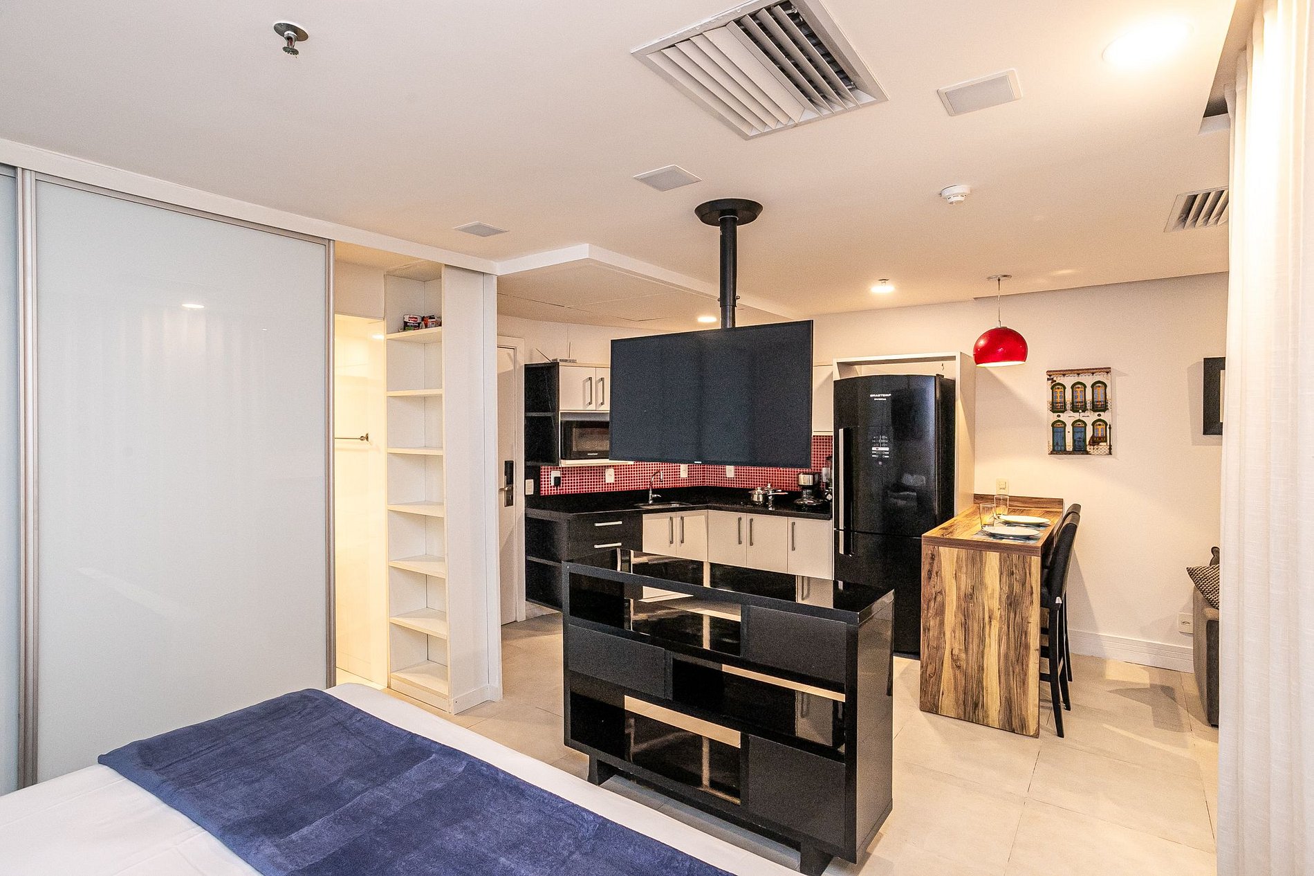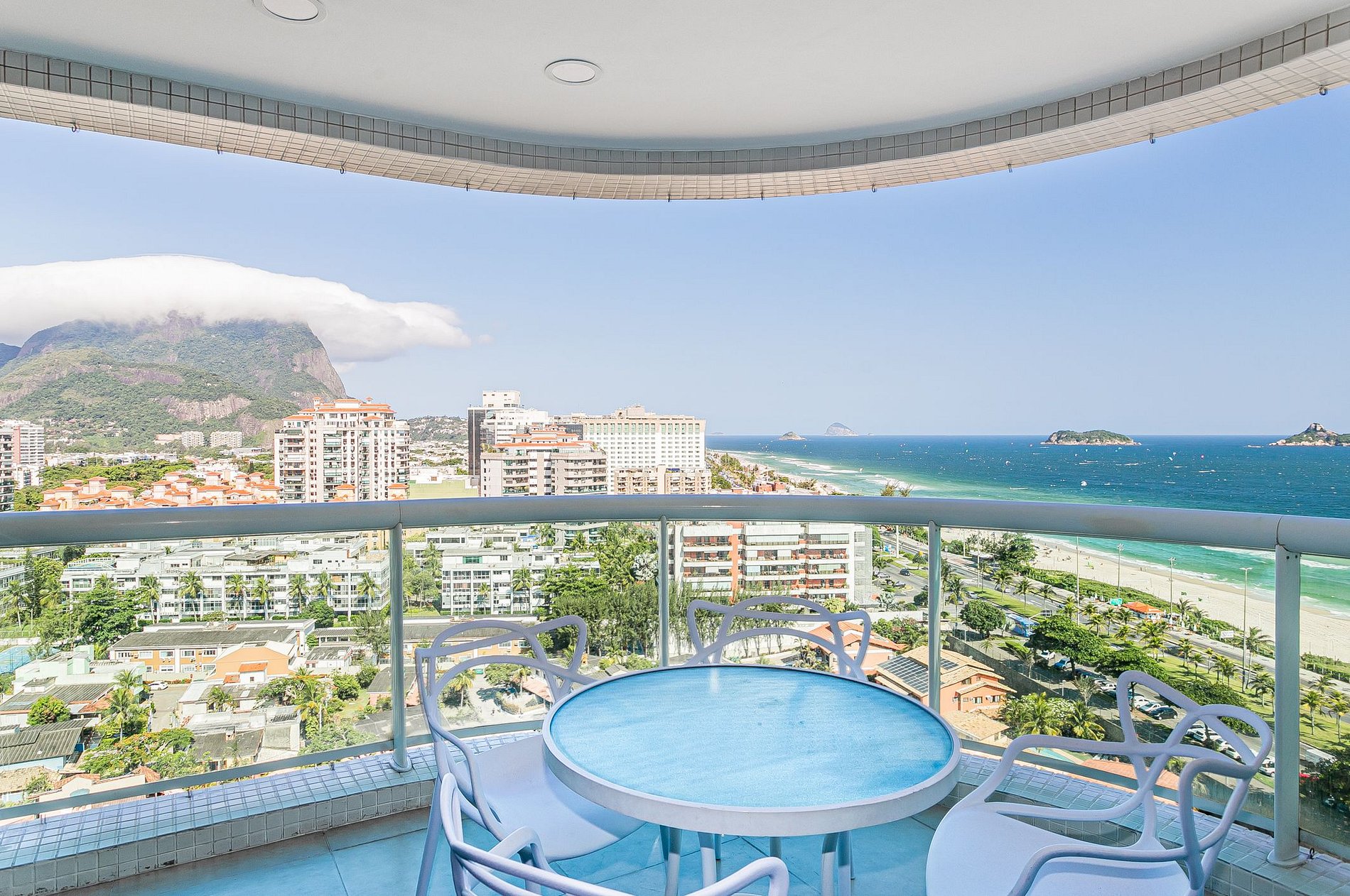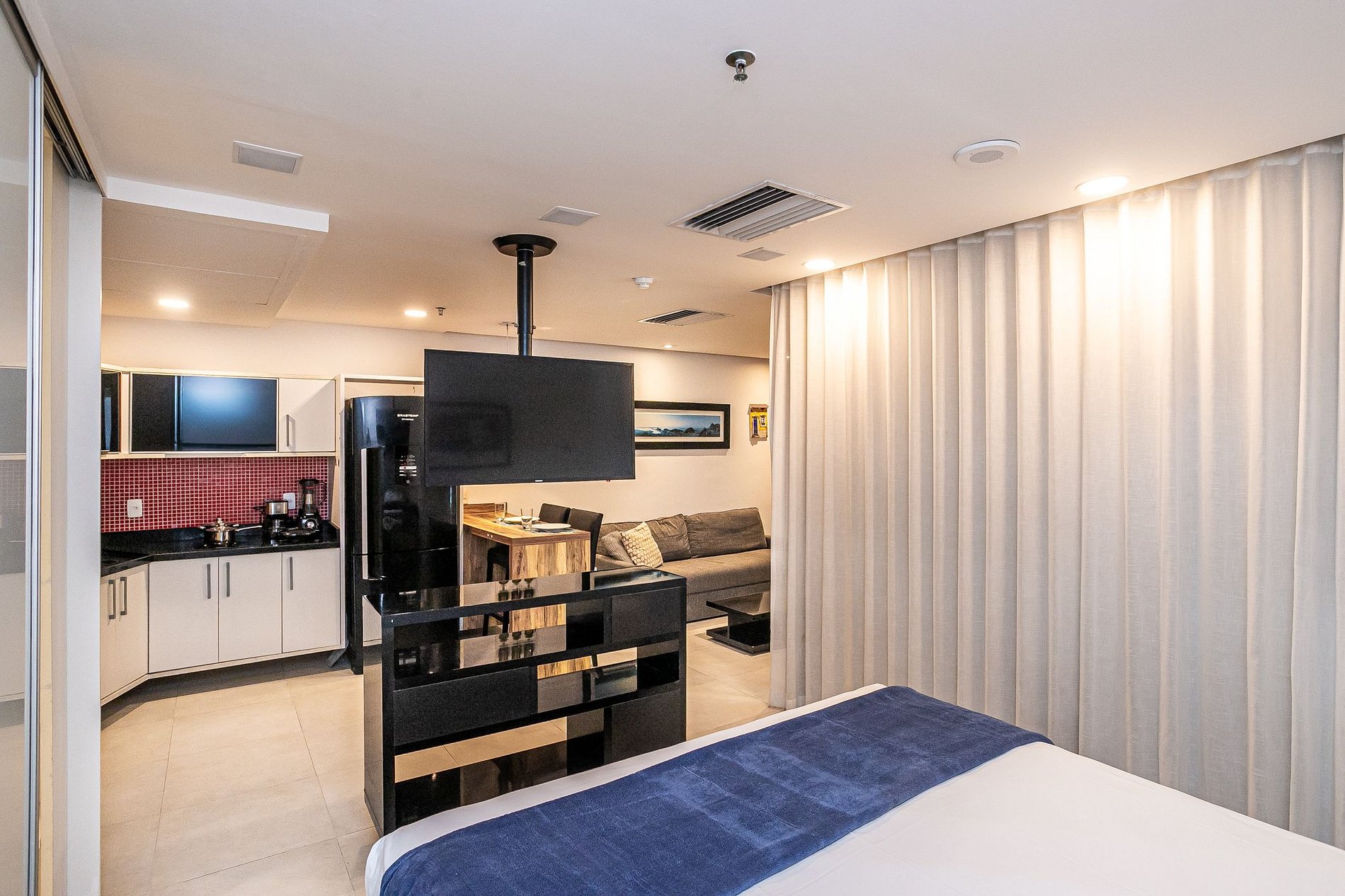 Estudio com cama Queen, cozinha integrada, sala de estar e varanda com vista total para a praia da Barra da Tijuca. O condominio oferece toda a estrutura de lazer (piscina, sauna, academia), Spa (serviço oferecido diretamente no hotel e não incluso na hospedagem) e serviço de limpeza. O prédio também conta com lavanderia pay per use. Tem a comodidade de um restaurante no lobby, salão de beleza e serviço de câmbio.