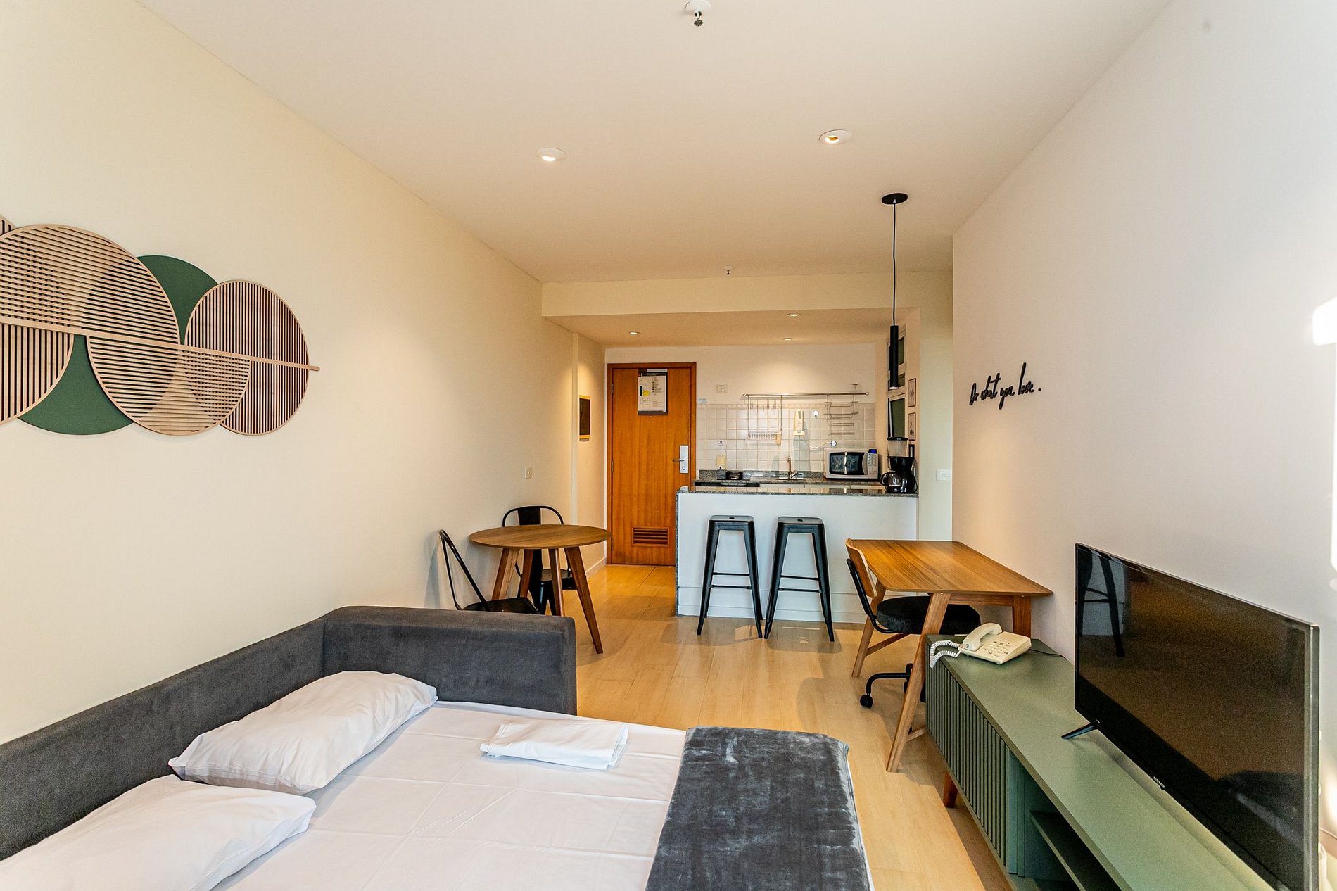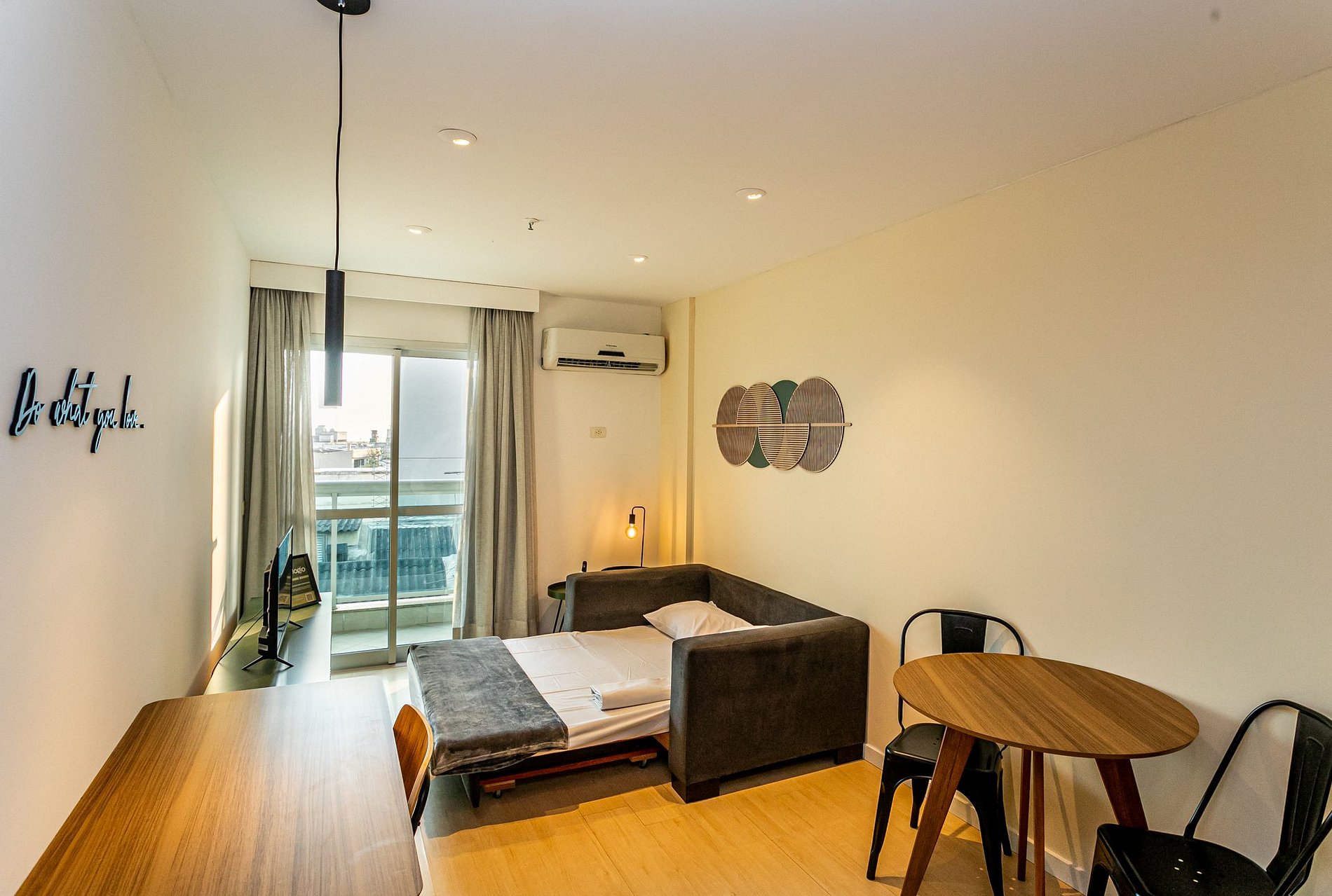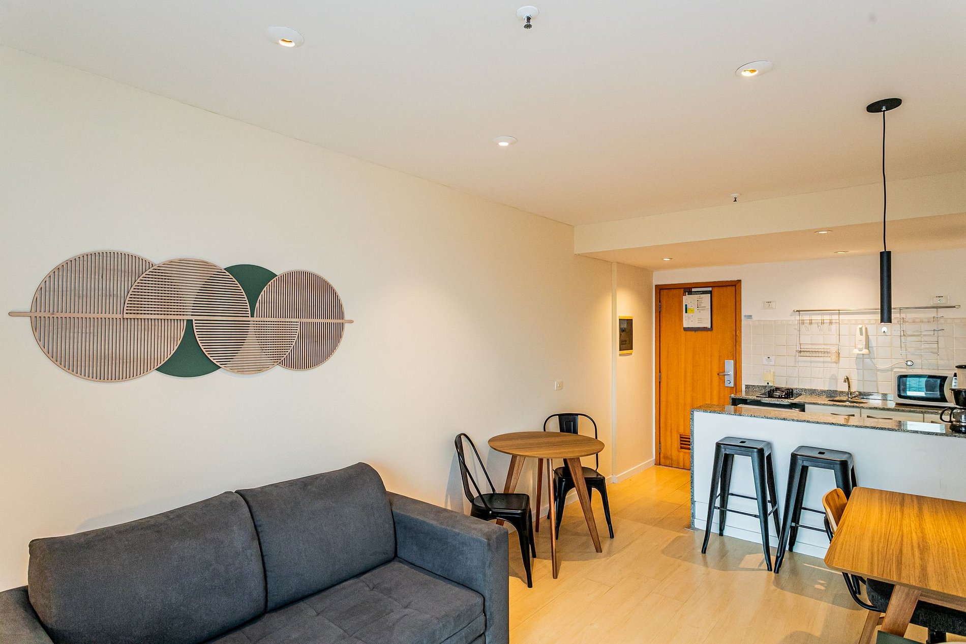 Nossas unidades se localizam em um prédio com toda a infraestrutura de lazer (piscina, sauna, fitness), serviço de arrumação (agendado na recepção), estacionamento, recepção 24 horas e também um mercadinho e uma lavanderia pay per use. você terá todas as comodidades, conforto e segurança em uma localização perfeita!